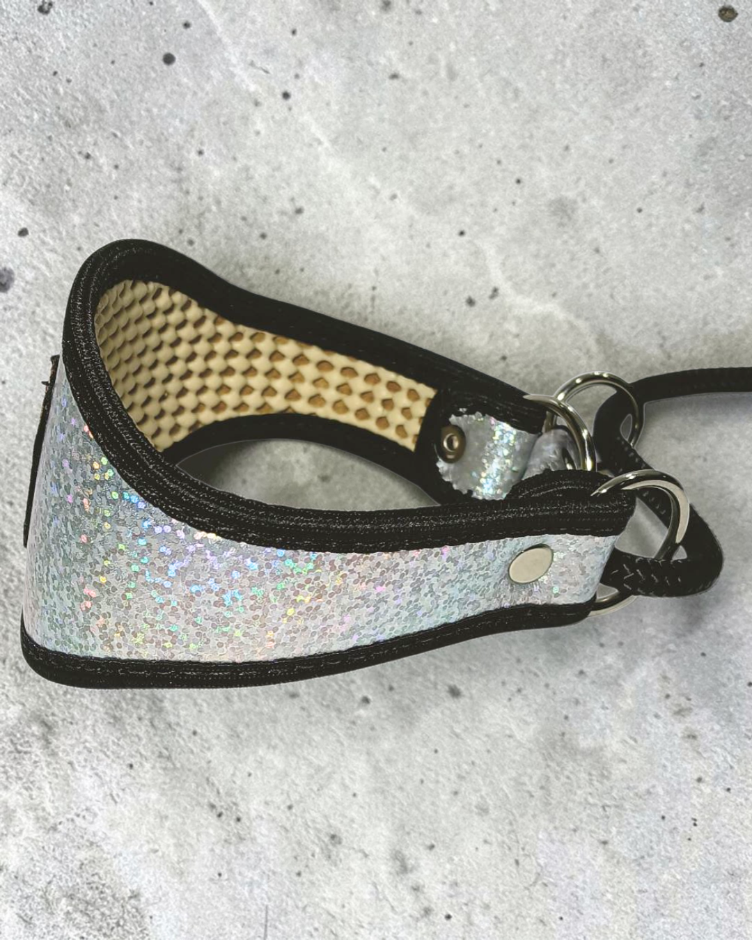 Confeccionada em couro legítimo, a Coleira Galgo combina durabilidade com acabamento refinado. Disponível em versões com tecido liso ou glitter, é perfeita para tutores que valorizam qualidade e personalidade.